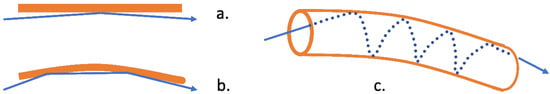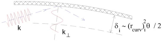 Further, we can estimate the limits when the wave peculiarities become important in description of the radiation propagation in capillaries [97]. If we imagine the motion of a photon inside a capillary through multiple grazing reflections from the inner wall of the capillary, then the imaginary trajectory of a photon is a kind of spiral with two limiting curvature values, from the inner radius of the capillary to the curvature radius of entire capillary (defined by the capillary bending angle). Generally, for a photon with the wave vector propagating along a curved surface with the curvature radius (), we can define a longitudinal wave vector, , as well as a transverse wave vector , (Figure 6). Hence, the wave approximation can be applied to the description of the radiation reflection for the part of radiation propagating at very sliding angles within the above-surface layer ∼, i.e.,