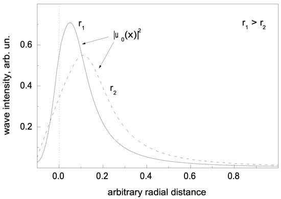 demonstrates the wave-guiding character of radiation propagation in the channel () [99,116]. Here, is the Airy function, and is the arbitrary unit characterising the capillary substance. Expression (12) describes the radiation modes in a capillary, i.e., the surface channeling states, that propagate close to the waveguide wall. Figure 7 shows an example of the spatial radiation distribution for two different capillary radii. This solution reveals that the wave functions are damped both inside the channel wall and moving from the wall towards the center.