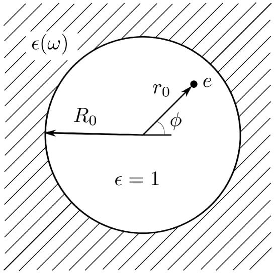Let us consider the electromagnetic field in a nonmagnetic substance of the permittivity that occupies the infinite space with a cylindrical cavity of radius inside (Figure 8). Then, in absence of free currents and charges, based on Maxwell’s equations, the Fourier components of the field scalar and vector potentials are defined by the following equation