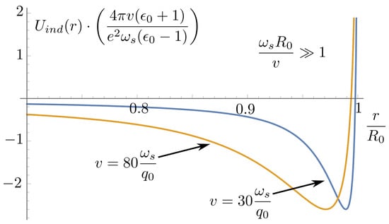 where the function is characterised by some local maximum. It permits the potential minimum position to be revealed at with the minimum value of the induced potential (Figure 10). If we define formally that the ratio is a certain “cyclotron frequency” for a particle flying in a capillary, then we can conclude that at the plasmon frequencies much lower than the cyclotron one , the interaction potential of the particle with the surface is a reflective barrier. On the contrary, when the plasmon frequencies of the dielectric surface exceed the cyclotron frequency of the moving particle , the interaction potential becomes attractive.