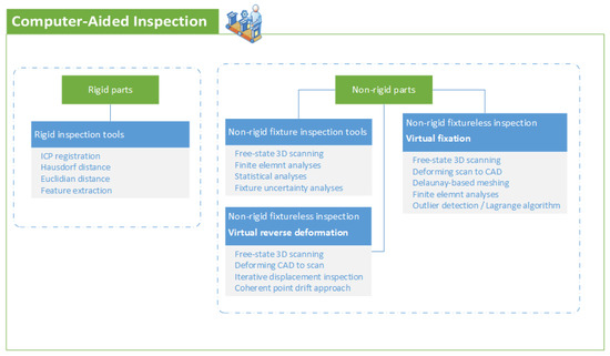For developing a DT, the raw data of a physical system is collected to extract inspection features and analyze the physical system in real-time. Computer-Aided Inspection (CAI) can help to identify defects and abnormalities occurring in the geometry of a physical system. A 3D scan measurement is one of the CAI tools which provides non-contact, non-destructive, and accurate measurements of a physical system. In other words, it is a 3D geometric inspection technology using data acquisition and data pre-processing to obtain the size and shape of a physical part to display the part in digital space in three dimensions. The 3D scanning provides an opportunity to immediately detect where the digital replica does not match with the 3D CAD model. Three-dimensional scanning is a viable option for the quality control of geometrical features of special welding jigs and fixtures. Using 3D scanning, it is possible to identify where deviations occur, and to measure them instantly. To better understand Geometric Dimensioning and Tolerancing (GD&T), manufacturing standards such as ASME Y14.5 and ISO-GPS have been developed in the era of automation. In addition, as part of its standards and requirements, the American Society of Mechanical Engineers (ASME) also established rules, definitions, defaults, and recommended practices. According to the ASME, parts and workpieces should be evaluated in a free state. Therefore, it is necessary to consider the compliance and deformation of non-rigid parts during the inspection. In response, definitions for geometric dimensioning and tolerancing of non-rigid parts have been developed, based on the ASME Y14.5 and ISO standards. Figure 1 presents the types and tools of CAI algorithms. In fact, inspection 4.0 aims at intelligent inspection by illustrating the basic work that can be implemented. Based on the compliance behavior and inspection parameters, a digital inspection protocol can be implemented onto the cloud, and the appropriate machine and inspection method will be selected. This novel aspect will be presented in the upcoming parts of this article. Generally, components are designed to fit into the right material and mechanical properties based on rigid and non-rigid concepts in computer-aided modeling.