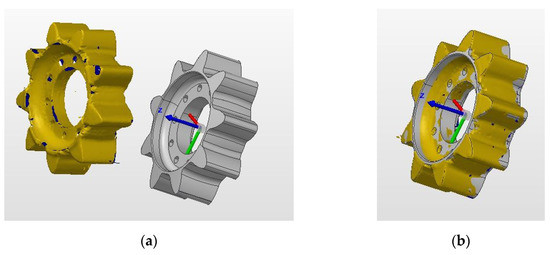 Regarding the compliance behavior of parts, rigid and non-rigid parts, CAI algorithms are developed. CAI is primarily used for comparing the reference geometry, computer-assisted design (CAD), with measured data, scan models [34]. Due to gravity and/or residual stress, some mechanical components often have different shapes in the free-state position compared to the state-of-use position. To make it possible to inspect different types of parts, different registration methods have been developed to classify workpieces into rigid and non-rigid ones. Furthermore, rigid registration is the primary step in computer-assisted inspections of non-rigid parts. In conventional CAI software, it is assumed by default that any data entered into the software is from a rigid part. Therefore, any deviation between the input data and the nominal CAD model should be considered a potential manufacturing defect [35]. Rigid registration has the primary goal of bringing CAD and scan models into a common coordinate system without deforming either model. The model is translated and rotated using an optimal transformation matrix without affecting its shape [36]. Initial CAI approaches were introduced using a rigid registration algorithm with Iterative Close Points (ICP) [37]. The ICP algorithm is known as one of the most robust and efficient rigid registration approaches. Although various methods have been developed over the years—including those described by researchers [38,39]—in different domains, such as aeronautic inspections, the ICP algorithm remains a widely used registration approach [40], thanks to its statistically robust and reliable method of registering. A CAD and a scan of a workpiece that is not presented in the same coordinate systems are shown in Figure 2a, and the ICP algorithm applies the best geometrical fit in Figure 2b. In this regard, the closest point in the reference set (CAD) is first identified for every point the point cloud set contains. The transformation matrix (rotation and translation) is then calculated, to move the CAD model towards scan data. This iteration is repeated until the best geometrical fit is obtained.