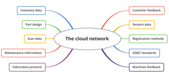Industry 4.0 is the latest revolution in the industrial era, and refers to the digitization of manufacturing by merging physical and virtual (digital) worlds. Digital twins (DTs) are a strategy within Industry 4.0, operating on the virtualization principle [48]. DTs are digitalized integrated systems to monitor, analyze, and simulate the behavior of a physical system. DTs are composed of three main components: the physical system, the virtual system, and the communication layer that connects these two systems. The communication layer is a linkage for data storage, data processing, and data mapping functionalities [49]. The data from the physical and virtual systems must be stored and processed in the communication layer. In this regard, the communication layer needs to be capable of transmitting a big amount of data (big data) in addition to easy fault detection characteristics. Internet of Things (IoT) technology can be used to make interactions between different layers of the integrated systems for real-time data transmission. IoT effectively maintains two-way synchronization of physical and virtual systems, to keep the virtual system updated and to provide real-time control commands for the physical system. The physical system changes are reflected in the virtual system; in other words, the virtual system is updated by employing feedback from the physical system. Real-time control commands are made based on the past and present conditions of the physical system to take care of the consistency of the manufacturing process and the quality of manufactured parts [50]. The constant synchronization between physical and virtual systems through the communication layer ends up in a real-time quality control platform which is also supported and updated by the physical system. As illustrated in Figure 3, all sorts of information originating from physical and virtual systems—GD&T standards, historical data, customer feedback, and fabrication protocols—are communicating with the cloud network to provide enough material to make decisions. Continuous and online communication between different physical and virtual data providers is only made possible by the ability of IoT [51] to transmit large volumes of data.