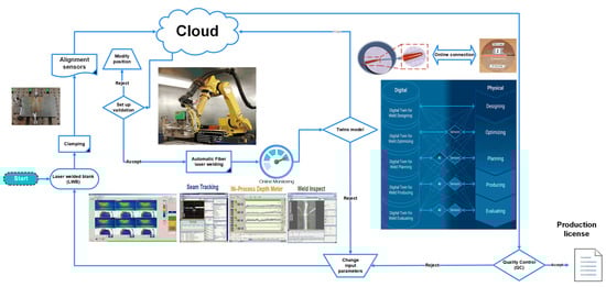 Smart welding is heading inevitably toward the Industry 4.0 paradigm. A schematic of the DT model designed for intelligent laser welding leading to a product license for laser-welded blanks is presented in Figure 4. In this DT, all data from the physical system, including seam tracking, in-process depth meter, and weld inspect data, are communicating with the cloud to update and support the cloud. There is a two-way network of interactions between consequent stages of physical and virtual twins, to transfer and update information, guaranteeing high-quality laser seam according to standards, process command, and specifications defined in the cloud. The application of DTs might facilitate the provision of production licenses for parts manufactured in different production sites, with no need to re-inspect the parts.