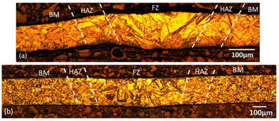 Optical micrographs showing weld profiles: (a) 100 µm thick welded with 50 W of power and at a speed of 20 mm/s, and (b) 200 µm thick welded with 100 W of power and at a speed of 30 mm/s.