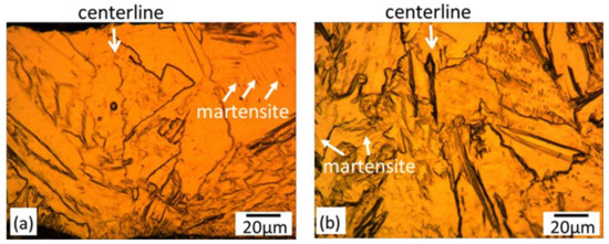 High magnification optical micrographs showing the weld centerlines and martensite (α’) phase on the (a) 100 µm thick foil welded with 50 W of power and at a speed 20 mm/s, and the (b) 200 µm thick foil welded with 100 W of power and at a speed of 30 mm/s.