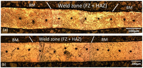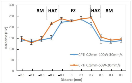 The results from the microhardness testing showed that HAZ and FZ had higher hardness compared with the base metal (Figure 6 and Figure 7). This probably is due to the presence of α’ (martensite) in WZ. The presence of α’ is associated with a fast cooling rate because both samples were fairly thin. Danielson et at. reported an increase in the weld zone area due to a high oxygen content [18]. In addition, the hardness of the 100 µm thick foil on the HAZ area increased earlier than that of the 200 µm thick foil due to its thinner size; hence, it had arguably faster cooling rates and more martensite (α’) compared with the later foil.
