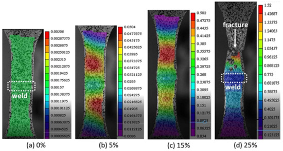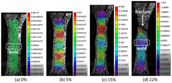 Figure 8 and Figure 9 show the strains within the samples at various location along the gauge length for the 100 µm and 200 µm thick foils, respectively. At an early stage, e.g., roughly less than 5% strain (Figure 8b and Figure 9b), it is obvious that localized strains (necking) started to take place on each side (outside) of the weld zone, as indicated by the red color. Necking continued within these areas until the strains reached around 15 to 17% before a localized necking at a “single” location prior to fracture (Figure 8d and Figure 9d). Figure 8d and Figure 9d present the strain experienced by the samples upon fracture, i.e., around 22% and 25% for the 100 µm and 200 µm thick samples, respectively. The reason for the slightly higher percentage of strain (i.e., higher elongation) on the 200 µm thick samples could be due to their thicker sizes, which may delay the localized strain taking place. All of the tested samples fractured outside the weldments, which indicated a good weld quality and strong joints (also shown and confirmed by the high hardness in the weld zones).