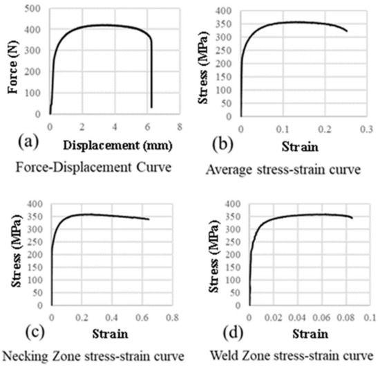Diagrams showing (a) force−displacement curves and (b–d) stress−strain curves representing various stages/places during tensile testing on the 200 µm thick foil, with 100 W of power and at a speed of 30 mm/s.