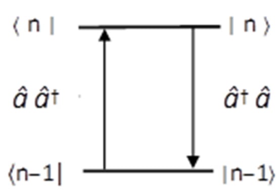 and the second operation–illustrated in Figure 1—as a one-step transition operator between two consecutive number states, each operator acting on the state vector next to it (or the left-hand operators acting on the Hermitian conjugate wave functions ⟨n|, the result being, for from Equation (5b):