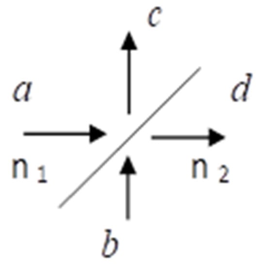For a dielectric interface beam splitter as sketched in Figure 3, with the arrows indicating the converging and diverging waveguides, the reflected and transmitted optical fields will lead to the transformation of the field operators based on Fresnel coefficients: