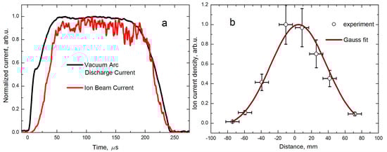 Vacuum arc discharge current with a copper cathode and ion beam characteristics: (a) waveforms of the vacuum arc discharge current and copper ion current at the center of the beam, normalized to maximum values, Id = 200 A, Ii = 4 mA; (b) the current density distribution over the ion beam cross-section normalized to the maximum value of 4 mA/cm2.