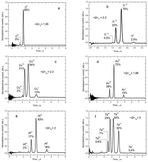 The results of studying the mass–charging composition of the ion beams extracted from the plasma of a vacuum arc discharge with cathodes made of graphite, titanium, copper, gold, platinum, and tantalum are shown in Figure 4 as time-of-flight spectra normalized to the amplitude of the maximum peak. Under the symbols of ions with the charge state n+, the values of their fractions fn in the total particle flux of the corresponding material are given, as well as the values of the average charges <Q>, determined using the following expression (2).