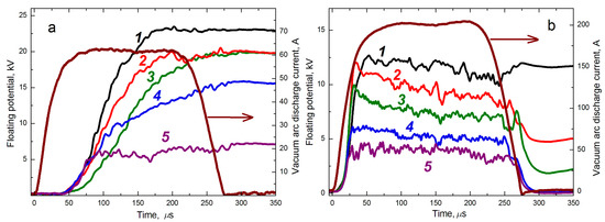 Waveforms of the floating potential of the insulated collector and the current of the vacuum arc discharge: (a) Id = 60 A; (b) Id = 200 A; 1—5 cm, 2—10 cm, 3—20 cm, 4—30 cm, 5—40 cm—collector position at both Id.