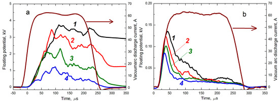 Waveforms of the floating potential of an insulated collector and the current of a vacuum arc discharge with an additional puff of argon: (a) p1 = 6 × 10−5 torr; (b) p2 = 4 × 10−4 torr; 1—5 cm, 2—10 cm, 3—20 cm, 4—40 cm—collector position at both pressures.