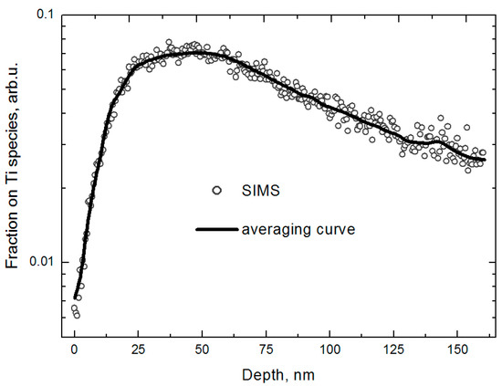 As a result of the analysis of the mass spectra of the sputtered and ionized atoms, it was shown that titanium atoms were present among the sputtering products. Their depth distribution is shown in Figure 7. On the surface of the alumina ceramics, the proportion of titanium atoms is slightly more than 5 × 10−3 at.%. In the direction from the surface of the substrate towards its body, there is an almost linear increase in the content of titanium atoms up to a level of 4 × 10−2 at.% at a depth of approximately 13 nm. After this mark, the distribution function increases non-linearly until the maximum value of 7 × 10−2 at.% is reached at a depth of 48 nm. As follows from Figure 7, the “hump” of the distribution is weakly expressed and rather resembles a “plateau”, which occupies the region from 23 to 60 nm deep from the sample surface. The etch depth of the diagnostic crater was approximately 160 nm. Up to this value, the distribution function shows a gradual decrease in the content of titanium atoms to a level of 2.7 × 10−2 at.%.