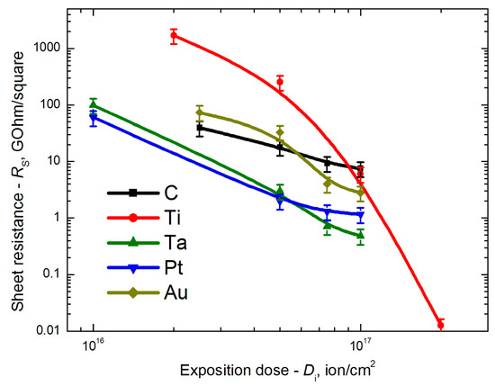The choice of the dimension of the surface resistance deserves special attention. Traditionally, “Ohm·m” or “Ohm·cm” are used, and to switch to these units of measurement, it is necessary to multiply the surface resistance determined using expression (5) by the thickness of the ion-modified near-surface layer. This approach is used to determine the surface resistance of deposited coatings, provided that the thickness and the elemental and phase composition of the coating are highly uniform. However, because of the analysis of the implantation profile obtained using secondary ion mass spectrometry, it was shown that the distribution of the concentration of implanted metal atoms over depth is nonuniform (see Figure 7). Therefore, under the conditions of this study, the use of the unit of measurement of surface resistance, “Ohm·cm”, would not be correct. Connected to this fact, the dimension of “Ohms per Square” was used, the value of which is directly determined from (5).