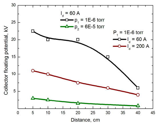 The reason for the decrease in the floating potential of an insulated collector (Figure 10) when it is removed from the ion source was as follows. When the insulated collector was reached by the ion flux at the front of the ion current pulse, it was charged to a sufficiently high positive potential. The subsequent spatiotemporal group of ions in the pulse experienced the decelerating effect of the field of a similarly charged collector. The slowed ions were reflected by the electric field of the beam toward the walls of the vacuum chamber, where they arrived with an energy sufficient to initiate ion–electron emission. These secondary electrons, according to the scenario described above, were accelerated toward the ion beam and the charged collector. Thus, partial compensation of the charge brought about by the accelerated ions took place. When the collector moved away from the ion source, there was an increase in the surface area of the cylindrical wall of the vacuum chamber (Figure 2), which surrounded the space of the ion beam between the ion source and the collector. The consequence of this was an increase in the flux of secondary electrons, contributing to an even greater neutralization of the space charge of the beam and the charge of the collector. An increase in the pressure in the region of beam transport led to a decrease in the collector potential to a level of 10% of that of the accelerating voltage. In this case, the accelerated metal ions collided with argon atoms and experienced the processes of recharging and deceleration. In this way, pairs were generated—fast neutral atoms and slow ions—which were accelerated by the space charge field of the ion beam toward the wall of the vacuum chamber, from which electrons were knocked out. These electrons filled the ion beam drift space and compensated for the collector charge. The fact that the ion recharging took place in a fairly extended volume and not only in the region of a charged collector led to the generation of a larger flux of reflected ions and, consequently, a larger flux of compensating electrons. Therefore, for example, when the pressure was increased to 4·× 10−4 Torr, the insulated collector was charged at the front of the beam current pulse to a potential of no more than 150 V at an accelerating voltage of 30 kV, which dropped during the pulse duration to a level of 10 V (Figure 6b).