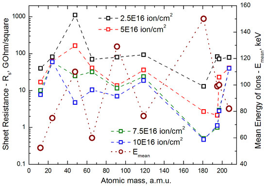 The dotted lines between the points are drawn conditionally, since it was not possible to study the full range of materials. Nevertheless, at implantation doses of more than 5 × 1016 ion/cm2, the positions of the experimental points acquire an identical structure. It is quite obvious that the surface resistance tends to increase on going from tantalum to platinum, gold, and lead. On this coordinate field (Figure 11), the dependence of the average energy of accelerated ions was also plotted, which was determined based on time-of-flight mass–charge spectrometry data (Figure 4) and [8] using Equation (3), where Uacc = 50 kV in all experiments on ion implantation. When compared with the dependencies of the surface resistance obtained at implantation doses of more than 5 × 1016 ion/cm2, it is noticeable that, starting from titanium (atomic mass—47.9 a.m.u.), the experimental points are in antiphase. The local maximum of the average ion energy corresponds to the local minimum of the surface resistance, and vice versa. Of course, the results of ion implantation do not store the memory of the charge state of metal ions in the beam. Nevertheless, the kinetic energy of ions interacting with the target material ultimately determines the configuration of the implantation profile in the surface layer [38,39], which determines the conditions for transporting charges in a composite medium formed by metal particles immersed in the insulating material of the ionic target. For a more complete physical understanding of the surface resistance, further studies will be required to fill in the gaps in the dependencies presented in Figure 11.