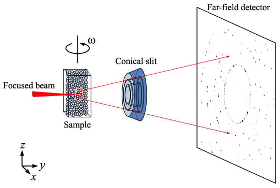 Schematic of the experimental setup. The focused X-ray microbeam parallel to the y axis is irradiated on a polycrystalline sample rotated around the z axis. The sample rotation angle is defined as . Diffracted beams from multiple ferrite grains in the sample pass through the conical slit for -Fe and are detected as diffraction spots in the far-field detector. In this scanning 3DXRD setup, ferrite grains and pearlite correspond to the visible grains and the invisible phase, respectively.