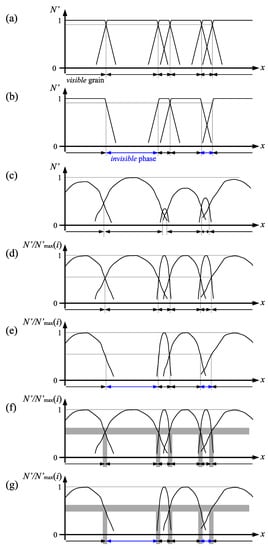The modified completeness is based on the completeness N/ of the conventional scanning 3DXRD [69], where N is the number of detected diffraction spots for a visible grain, and M is the theoretically expected maximum of N. The completeness represents the probability of the existence of visible grains. Generally, the completeness curves of individual grains are continuously distributed from the inside to the outside of the grains. The grain boundaries between the visible grains appear where neighboring completeness curves cross each other. In ideal cases, without experimental errors, is almost 1 inside the visible grains and sharply drops outside the grains (Figure 4a). Then, the grain boundaries can be determined even for a sample containing an invisible phase (Figure 4b). In real cases, however, may not be up to 1 and gradually decreases from the center of grains to the outside of the grains owing to the insufficient diffraction intensities, the insufficient quantum efficiency, and the noise of the detector, as well as the short exposure time (Figure 4c). These experimental limitations result in orientation maps with reconstruction errors or artifacts, in which small grains close to large grains shrink or disappear, large grains close to small grains grow, and the concave and convex shapes of grains disappear. As artifacts exist more in samples containing an invisible phase, we propose as the modified completeness, where the denominator (i) is the maximum of of each grain, and i indicates that depends on the i-th grain. Using the modified completeness, the artifacts can be reduced (Figure 4d). Thus, we introduce the threshold of completeness , which allows the reconstruction of grain boundaries between the visible grains and the invisible phase (Figure 4e). In real cases with experimental errors, the completeness threshold may not be determined for all the visible grains in the FoV, resulting in uncertainties in the completeness threshold and the positions of the grain boundaries between the visible grains (Figure 4f), as well as the boundaries between the visible grains and the invisible phase (Figure 4g).