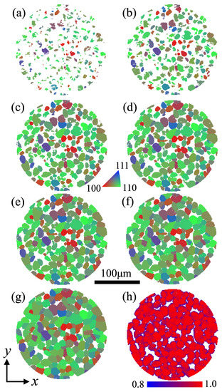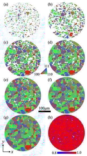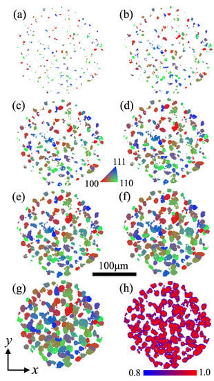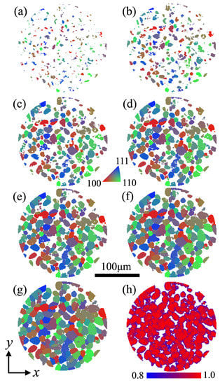 Orientation maps obtained from the S45C carbon steel sample with completeness thresholds of (a) 0.99, (b) 0.98, (c) 0.96, (d) 0.94, (e) 0.92, (B) 0.89, and (g) 0.85 and (h) the completeness map. The FoV diameter and pixel size are 200 m and 1 × 1 m, respectively. The orientations of the visible grains are represented by the z axis in the basic triangle of the pole figure of -Fe, and the uncolored white pixels indicate the regions below the completeness thresholds.