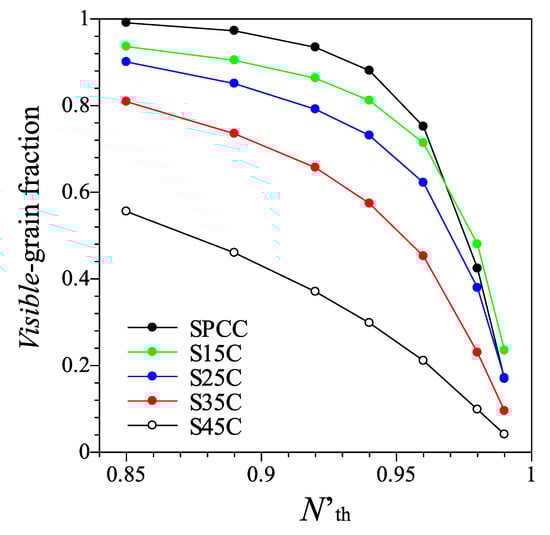When was reduced from 0.99 to 0.94, the fraction of the visible grains in the low-carbon steel sample increased sharply, reaching a plateau in the range of 0.89–0.94. This saturation point of the fraction curve at 0.94 corresponded to , at which most of the visible grain boundaries were formed, except for the grain-boundary triple points. Although the saturation point became unclear in the order of S15C, S25C, S35C, and S45C samples, it was obvious at the same threshold of 0.94 for the low-carbon steel sample and the S15C and S25C carbon steel samples.