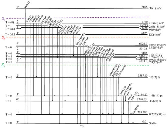 - McCutchan, E.A.; Lister, C.J.; Elvers, M.; Savran, D.; Greene, J.P.; Ahmed, T.; Ahn, T.; Cooper, N.; Heinz, A.; Hughes, R.O.; et al. Precise γ-ray intensity measurements in 10B. Phys. Rev. C 2012, 86, 057306. [Google Scholar] [CrossRef]