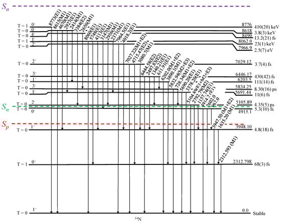 - Barker, P.H.; Scott, A. Energy of the 9.17 MeV excited state of 14N. Phys. Rev. C 2001, 64, 064305. [Google Scholar] [CrossRef]