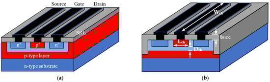 Cross-sectional views of n-channel enhancement-type (normally off) and depletion-type (normally on) JFETs fabricated in AIST are depicted in Figure 1. the Nominal channel length (Lch) and depth (Dch) were 2.2 and 0.6 μm, respectively. The channel width (Wch) was 72 μm. The gate and base layer were formed through the implantation of aluminum ions into an n-type epitaxial layer. The implanted aluminum concentration profile was confirmed using secondary ion mass spectrometry (SIMS) and the simulated aluminum profile [13]. Every two or three steps of the aluminum implantation to attain a box-shaped profile were carried out for each depletion or enhancement type. The source and drain (n+) regions were formed through phosphorous ion implantation. Ohmic contacts were formed through the deposition of nickel/aluminum, followed by sintering. Afterwards, aluminum contact pads were deposited.
