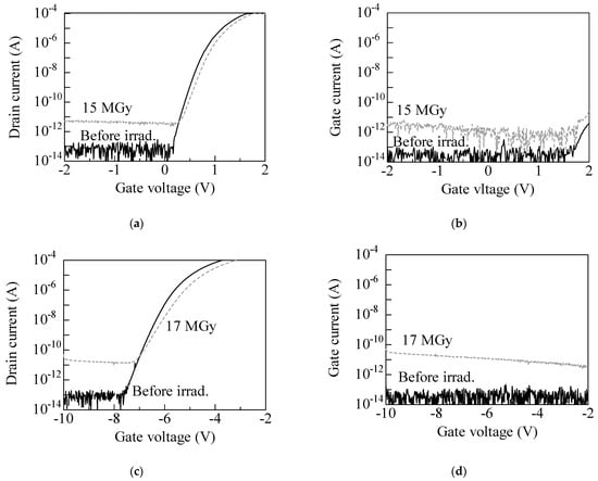 The ID–VG and IG–VG characteristics for the non- and irradiated SiC JFETs are shown in Figure 2a–d. Regardless of the device structure, increases in the subthreshold slope and positive shift were observed in the ID–VG curves after the irradiation (dashed lines). Values of the drain leakage currents in the ID–VG curves were nearly consistent with the IG leakage currents, indicating leakage paths between the gate and drain electrodes having formed after the irradiation.