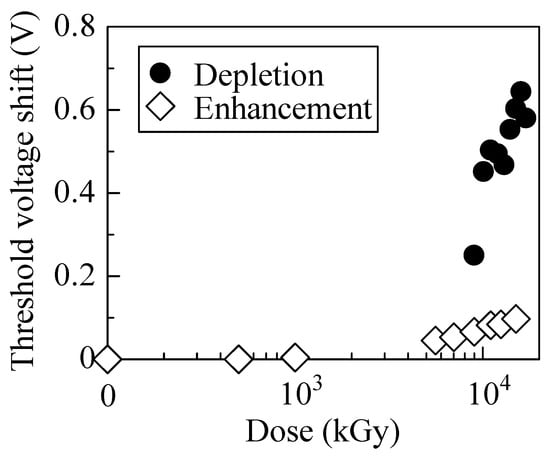The threshold voltage shift (ΔVth) from the nonirradiated devices was plotted in Figure 3. The initial Vth of the enhancement or depletion type was 0.96 or −5.27 V, respectively. The ΔVth of the enhancement type increased positively and reached approximately 0.1 V after 15 MGy, whereas for the depletion type, a much larger positive shift was observed. Although the depletion type was a single-gated structure (Figure 1b) and the Vth was expected to be two times larger than the double-gated ones [27], the approximately six times larger ΔVth at the same dose was of interest.
