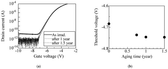 So as to evaluate the effect of the charges generated on the device surface, irradiated depletion-type JFETs were aged at room temperature. As shown in Figure 4a, the leakage current became as low as that for the nonirradiated device at 1 year after irradiation. The Vth slightly shifted toward the negative direction and was saturated after 1 year (Figure 4b. Given that the leakage paths were formed between the gate and drain electrodes, it was inferred that the leakage currents were caused due to electrons attracted by positively charged passivation oxide. As holes rapped in the oxide were annealed, the apparent positive bias applied to the gate was removed. This resulted in a slightly negative Vth shift. The aging experiment also suggested that a positive Vth shift was derived from the defects formed in the bulk region of the device.