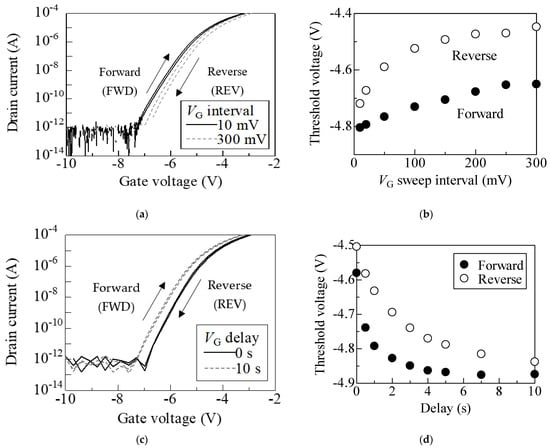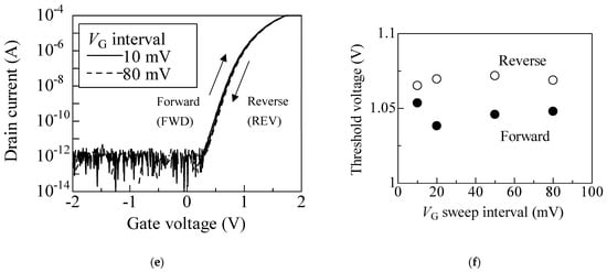 The ID–VG hysteresis of the irradiated depletion-type JFETs are shown in Figure 5a. The ID–VG curve positively shifted and the hysteresis became larger for 300 mV. The Vth of each sweep direction (forward (FWD) or reverse (REV)) were plotted in Figure 5b. Both Vths gradually increased and were almost saturated at 300 mV. With the VG sweep interval at 300 mV, the ID–VG curves shifted negatively for a longer delay, as shown in Figure 5c. The FWD Vth plotted in Figure 5d decreased and was saturated after 4 s, while the REV Vth (brank circles) more slowly decreased to 10 s. A decay as slow as several seconds implied that carriers were captured and released via the deep hole traps [28,29,30,31]. Meanwhile, no significant hysteresis appeared for the enhancement type (Figure 5e). Due to the relatively abrupt increase in the drain current that resulted from the double-gated structure (Figure 1a), the sweep interval was limited below 80 mV to obtain sufficient data plots for the Vth estimation. The difference between the FWD and REV Vths remained within approximately 0.05 V, as shown in Figure 5f, which was much smaller than that shown in Figure 5b.