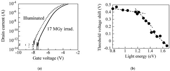 (a) ID–VG characteristics of 17 MGy irradiated depletion-type SiC JFETs. Dashed lines were measured during LED illumination. Center wavelength (light energy) of LED was 750 nm (1.67 eV); (b) FWD Vth shift from nonirradiated device was plotted as a function of light energy.