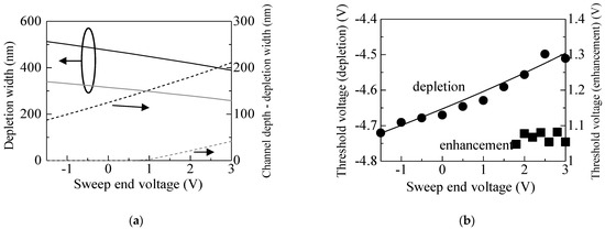 The calculated depletion width WD was plotted in Figure 7a. The WD decreased as the VG increased and was smaller for the enhancement type, while the channel depth–depletion width) (dashed lines) increased with an increasing VG. It was noted that that of the enhancement JFET was less than a half of the depletion type. This resulted from the short depletion width and double-gated structure, as the channel depth was 0.3 μm. Figure 7b shows the REV Vth as a function of the sweep-end voltage. The sweep interval was 300 mV. The REV Vth for the depletion type increased when increasing the sweeping range up to VG = 3 V. In contrast, the increment for the enhancement type was smaller.