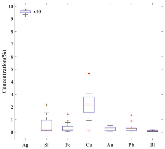 A summary of the concentration results is shown in Figure 2, where silver is rescaled by a factor of ten, and the red “+” sign marks the coins that do not fall within the interquartile range. The ranges of concentration variability for the detected elements are: Ag (92.32–97.73)%; Cu (0.04–4.66)%; Au (0.04–0.54)%; Pb (0.03–1.35)%; Bi (0.03–0.20)%, Fe (0.04–1.43)%. and Si (0.10–2.16)%.