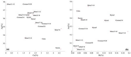 What changes in different historical periods is the use of Ag and Cu. The fineness (i.e., the purity of the content of the precious metal) is higher. Coins dated to the period from 450 to 350 BC were minted from high-grade silver (varying in fineness from 950 to 980) with a mixture of copper (0.10–3.00%—Figure 3a); the presence of other indigenous impurities is also recorded in silver: gold, lead, bismuth, and other elements, whose content, with some exceptions, does not exceed 1.5% (Figure 2). The silver content of coins dated 325 to 270 BC proved to be different. Coins from the Latin colonies in Campania, for example, were minted from high-grade silver (920–950 fineness) with a mixture of copper (1.5–5%), as well as lead and gold as trace impurities.