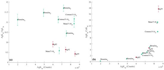 In the case of suberate, corroded or surface-enriched coins, an important disadvantage of EDXRF is its low depth of information, which is a function of the energy of both primary and fluorescent radiation, as well as the chemical composition of the sample itself. Surface results may not reflect the chemical composition of the nucleus. Therefore, the main question that arises is to what extent the chemical composition in the current state corresponds to that at the time of production [34]. To overcome this, the ratios and cross-ratios of the characteristic lines of Ag and Cu were studied. Quantitative data were not used for these measurements, but simply the intensities (counts) of the peaks were considered to perform the data analysis. Here, only a few significant XRF measurements of Heraclea, Croton 15–16 and Meta 17–18 coins were considered. These are those relating to a flat surface and to breaks or disintegrated points.