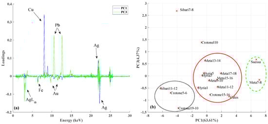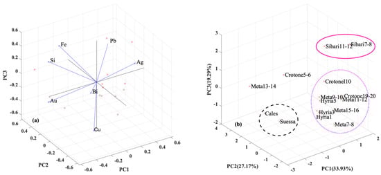 The biplot suggests that the largest contribution to the definition of PC1 is given by Ag, as opposed to Cu. On PC2, the largest contribution is given by Au and Bi, which derive from a raw material supply (mining). On PC3, Pb (technological process) is opposed to Fe and Si are correlated (same direction and modulus) depending on the surface pollution (Figure 5a). The score plot allows us to identify the subdivision of the objects according to these characteristics (Figure 5b).