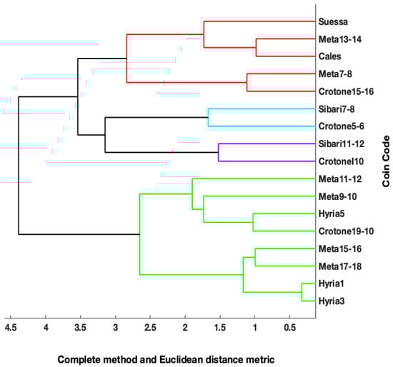 The coins were analysed by means of a completely non-invasive XRF analysis in the same museum where they are kept. The study of the composition of their silver alloy provides a great deal of information, thanks to the conspicuous production and use of this precious metal in this period. In fact, the coins are of high fineness, and the concentration ranges of the elements found are as follows: Ag (92.32–97.73)%; Cu (0.04–4.66)%; Au (0.04–0.54)%; Pb (0.03–1.35)%; Bi (0.03–0.20)%, Fe (0.04–1.43)% and Si (0.10–2.16)%. Although no cleaning of the coin surfaces was done, the coins were found not to have an altered surface layer (corrosion). Fractures or cracks present in some coins were carefully analysed with targeted measurements in order to evaluate the elemental content in more detail. The values of the concentrations and the Ag Kα/Lα and Ag Kα/CuKα ratios indicate the presence of an enrichment layer on the silver surface in some coins, which deserves further study. Multivariate statistical analysis, using GA, PCA, and HCA, made it possible to group the coins as accurately as possible based on the chemical information and spectra acquired and build models that organised the coins according to historical periods. The different methods agree sufficiently to identify some coins with anomalies. Most of the coins (Metapontum, Croton and Hyria) show similar concentrations of Ag and Cu, and the raw materials for their production and the technological process could be the same. In particular, Croton 19–20, Meta 15–16, Meta 17–18, Hyria1, Hyria3, and Hyria5 belong to the historical period from 400 to 340 BC. Although the Hera Lakinia type (Crotone 15–16) is an important historical source on the league and the political dynamics of the time, it shows surface anomalies, as illustrated in Figure 4; it could therefore be surface-enriched or subaerata.