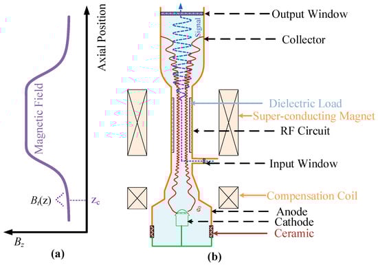(a) Magnetic field distribution consists of SCM and CC. (b) Schematic configuration of the dielectric-loaded gyro-TWT.