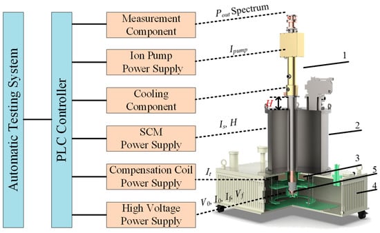 The experimental test system setup of gyro-TWT is shown in Figure 2. The testing process and parameters related to MIG are discussed here. The ATS controls the test instruments through the programmable logic controller (PLC). (1) The power supply provides the filament voltage (Vf) and filament current (If), which could heat the cathode. (2) The voltage on the cathode is V0, then the beam current I0 is emitted. (3) The magnetic field amplitude is determined by the SCM current (Is) and CC current (It). The relative axial position between gyro-TWT and SCM (H) is adjusted to change the relative magnetic ratio for the RF circuit and MIG. (4) The beam obtains a special α at the entrance of the RF circuit, then interacts with the microwave. The water load is a crucial component of the power detection device. By monitoring the liquid temperature, the output power of the gyro-TWT can be calculated. The frequency was measured by the spectrometer. The optimal output status of the gyro-TWT will be achieved by sweeping parameters like H, V0, I0, and Bz.