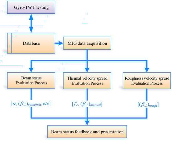 In our group of UESTC, a previously developed automatic test system (ATS) for gyro-TWT [31,32], has proven effective in accomplishing automatic data acquisition during high average/continuous-wave power operation experiments. To enhance the performance and testing efficiency of the gyro-TWT, a beam status online evaluation module (OEM) technology is built upon the ATS. (1) A comprehensive discussion on the impact of electric-magnetic field mismatch, thermal emission spread, and surface roughness emission spread on beam status is conducted, aligning the simulation data more consistently with experimental results. (2) The MIG is remodeled with actual conditions, enabling real-time acquisition of beam status information through the OEM. Utilizing feedback on beam state, external factors affecting beam quality, such as compensation magnetic field, SCM concentricity, and gyro-TWT position, are further adjusted to quickly reach the best performance. (3) A visualization interface is proposed based on the analysis. The OEM technology is validated in a W-band gyro-TWT, and experimental results indicate that the device operates stably for a long time under high power conditions. In comparison with existing testing methods, the proposed OEM technique can calculate the beam quality of the gyro-TWT under various operating conditions in real-time. Furthermore, the OEM technique is universally applicable to all dielectric-loaded gyro-TWTs developed by our group and has undergone experimental verification across the X-band to G-band [17,18,19,20,21,22,23].