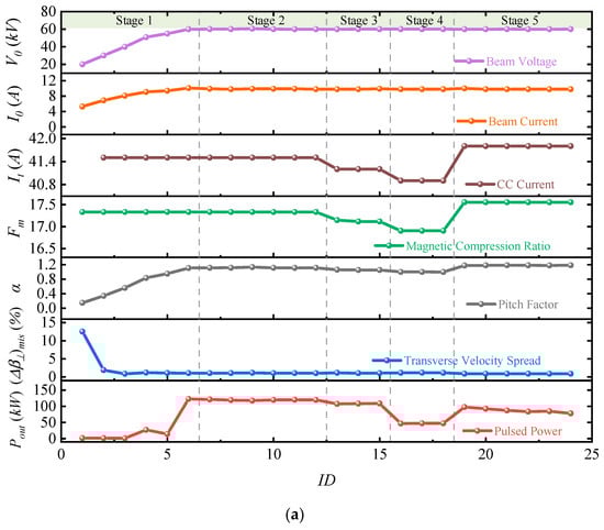 As shown in Figure 3, when the testing status changes, the OEM reads the operating parameters and then simulates and calculates the new beam status. (1) The electric and magnetic fields for the operating MIG are rebuilt according to instant operating parameters. Then, the trajectory is quickly simulated by the electron optics software. The beam status, such as α, (Δβ⊥)mis, R0, is evaluated. (2) The instant Tc is evaluated, and (Δβ⊥)thermal is calculated. (3) Read the roughness data and calculate (Δβ⊥)rough. Finally, the beam status is online feedback and presented to the tester. The results calculated by OEM can represent the actual beam status in the experiment. With reference to the assessed beam quality, adjustments to input parameters, such as H, V0, I0, and Bz, are made to further enhance the device’s performance while ensuring safe operation.
