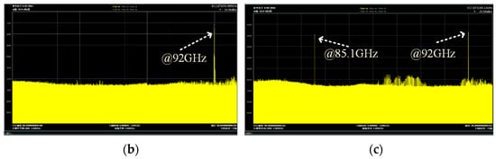 At Stage 1, V0 was applied gradually to the MIG, leading to a concurrent increase in both I0 and α. Upon reaching Stage 2, V0 and I0 attained the designated working values, with an evaluated α of about 1.11 and a measured Pout of 122 kW. The gyro-TWT operated stably, and the spectrum of the output signal was pure, as depicted in Figure 6b. Moving to Stage 3 involves adjusting It to modify Fm, causing a reduction in α to 1.05. Correspondingly, Pout decreased to 108 kW. At stage 4, α was further diminished to 1.0, leading to a rapid reduction in Pout to 47 kW. However, at stage 5, due to the increase in compensation current, the beam pitch factor increases, resulting in oscillations and power degradation. The corresponding oscillation frequency was noted to be at 85.1 GHz, as shown in Figure 6c. The realization of online beam status evaluation in the experiment enhances the transparency and safety of the testing process. It should be noted that the beam–wave interaction status of the gyro-TWT is not at the optimal frequency point for testing the evaluation module.
