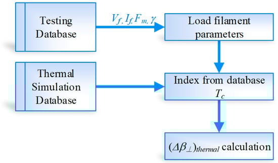 A thermal cathode structure is employed in the gyro-TWT, and the beam quality was influenced by the temperature distribution of the cathode, as mentioned in Equation (4). An inhomogeneous temperature distribution on the cathode surface can give rise to phenomena such as sideband electron emission, making the device unable to operate stably. The emitter operating temperature Tc is about 1050 °C. However, the actual Tc was hard to detect because of the vacuum environment and high voltage in an enclosure MIG. The temperature evaluation method by heating power (Pheat) is utilized. The detailed process flow is shown in Figure 7. The relationship between Tc and Pheat was simulated and stored in the database. Then, according to the instant Vf and If, Tc was evaluated. Finally, the (Δβ⊥)thermal was calculated.
