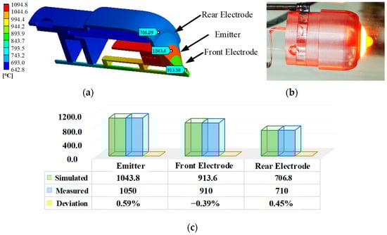 (a) Thermal analysis in the simulation. (b) Heated cathode. (c) Temperature deviation.