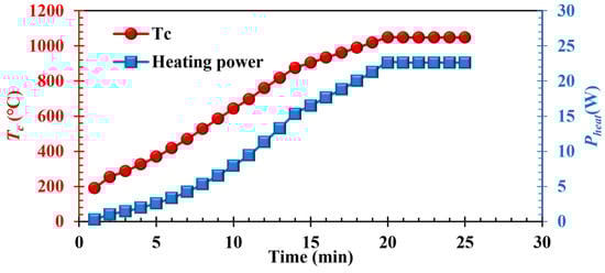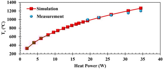 The relationship between Tc and Pheat is shown in Figure 9. Tc higher than 850 °C is recorded in the experiment because of the measuring range of the infrared thermometer. The measurement result matches well with the simulation, and the maximum deviation is about 5% at 1200 °C. The Tc–Pheat curve is stored in the database and employed to evaluate the operating Tc in testing.
