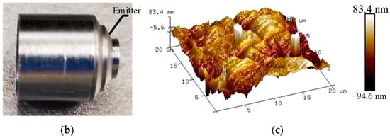 (Δβ⊥)rough depends on the surface roughness Ra in the fabrication process, and the evaluation process is shown in Figure 12a. The surface roughness of various cathodes has been measured prior to assembly and stored in the database. An emitter sample was measured by an Atomic Force Microscope (AFM), as shown in Figure 12b. Ra was about 23 nm for this cathode type under the current fabrication process. Ra is stored in the OEM, and the instant (Δβ⊥)rough is calculated using 5. The rest of the parameters are also read from the synchronized trajectory simulation.